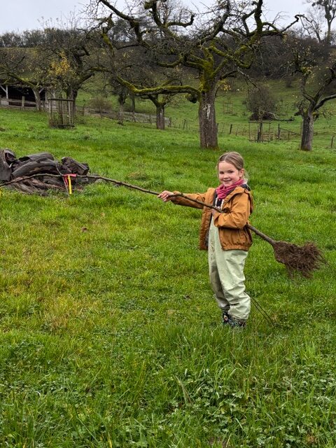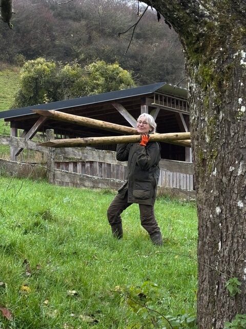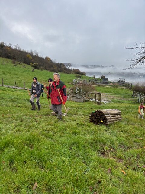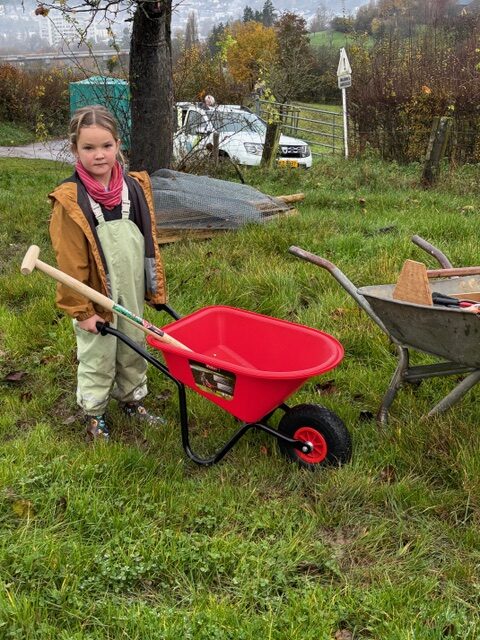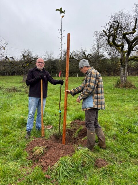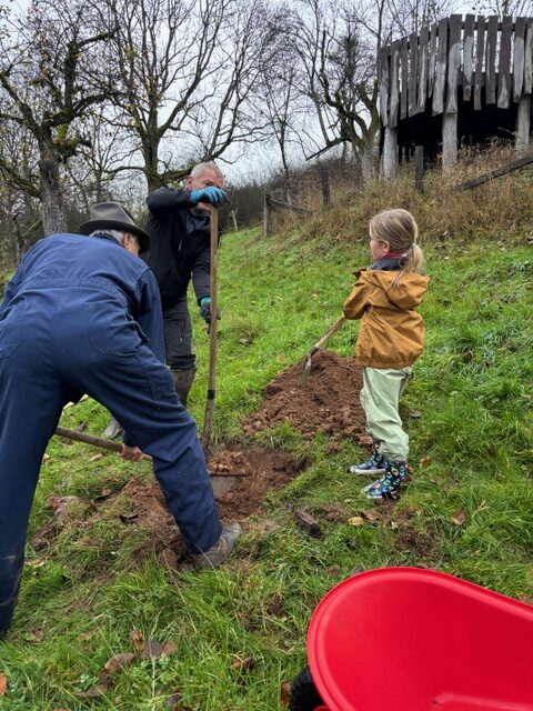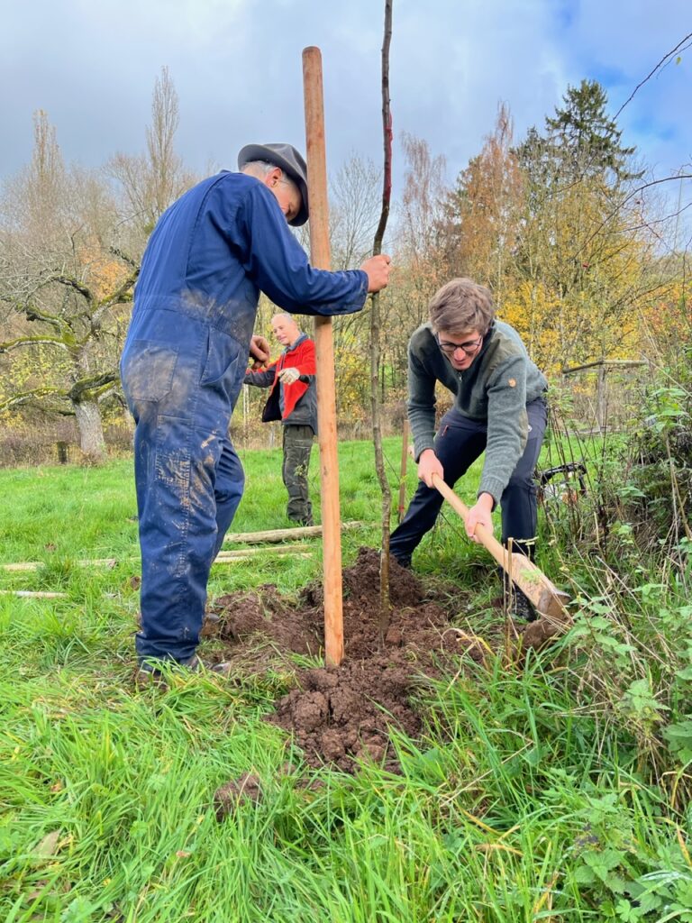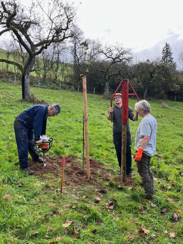 Nach Stunden haben die Bäumchen ihren Pfahl, die Verankerung und ihr Schutzgitter. So rennen sie auch nicht mehr davon 😉 und die müden Schaufler sinds zufrieden. Der 15. November war wieder erfolgreich.
