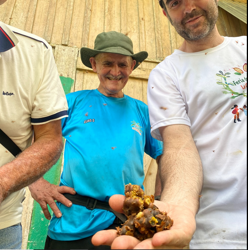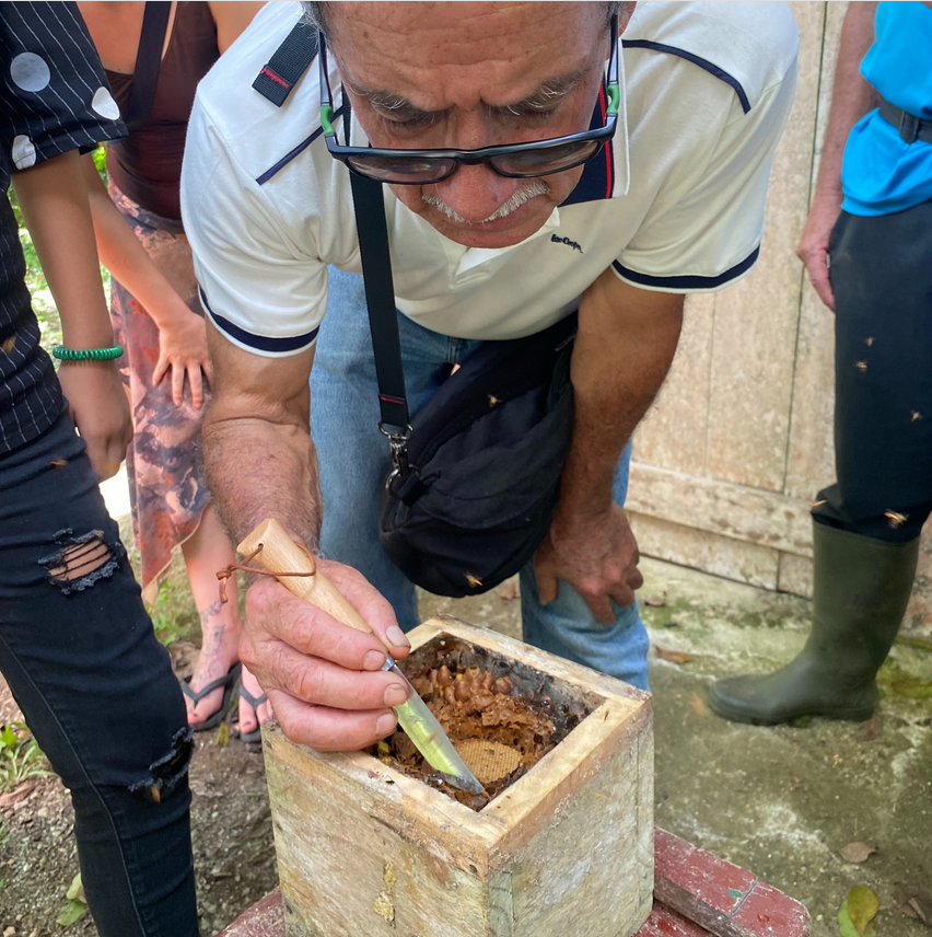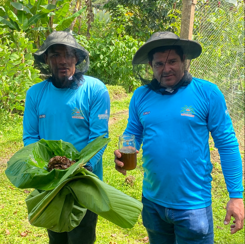 Den ersten workshop für dieses Jahr leitet Benjamín Bermúdez. Er erklärt unserem Cobiga-Team und Interessierten wie ökologisch wichtig diese Wildbienen für die Bestäubung sind. Sie stellen aber auch Propolis aus Baumharz her, das als Desinfektionsmittel verwendet wird. Honig wird enzymatisch aus Nektar gemacht und reift in den Waben und dann gibt es noch Honigbrot aus eiweissreichem Pollen und Nektar enzymatisch für die Fütterung der Larven bereitgestellt. Zum Abschluß wird auf unserer Finca Modelo noch ein Bienenstock geöffnet , geteilt und somit weiter vermehrt. Honig gibts natürlich auch.