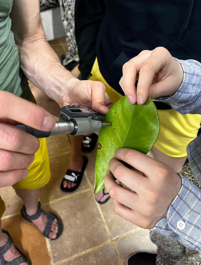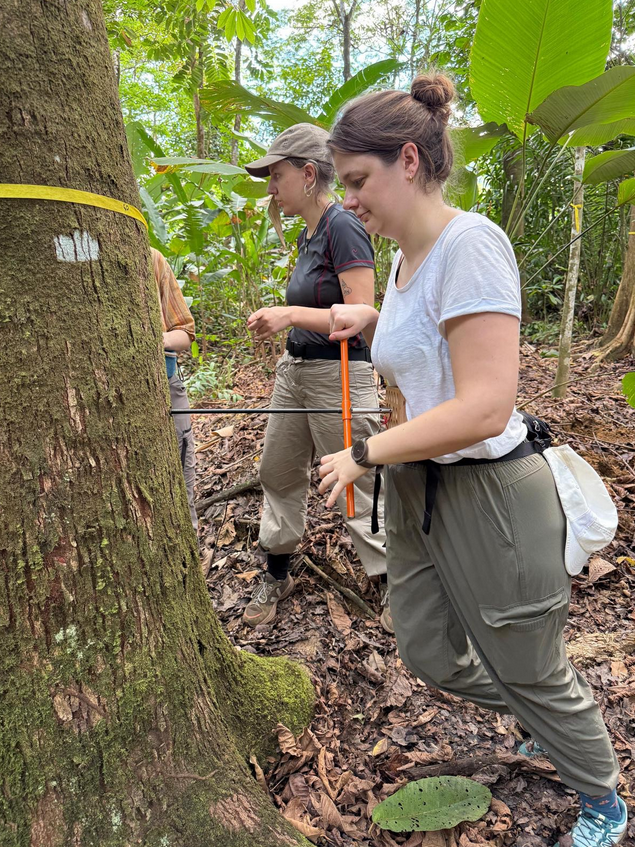 Bei Exkursionen in den Regenwald trainieren Studenten/Innen ihre Forscherfähigkeiten. Die Boku ist nur eine von vielen Universitäten, die spezifische Kurse mit unterschiedlichen Zielsetzungen anbietet. Dieses Jahr ging es um die Secundary Forest Regeneration: Also um das Erheben von Daten in unseren Korridorpflanzungen: Nach Messung von Höhe und Durchmesser der Bäume kommen noch Blatt- und Holzproben zum Einsatz um Gewicht, Dichte, Dicke und damit Blatt- und Holzeigenschaften herauszufinden.